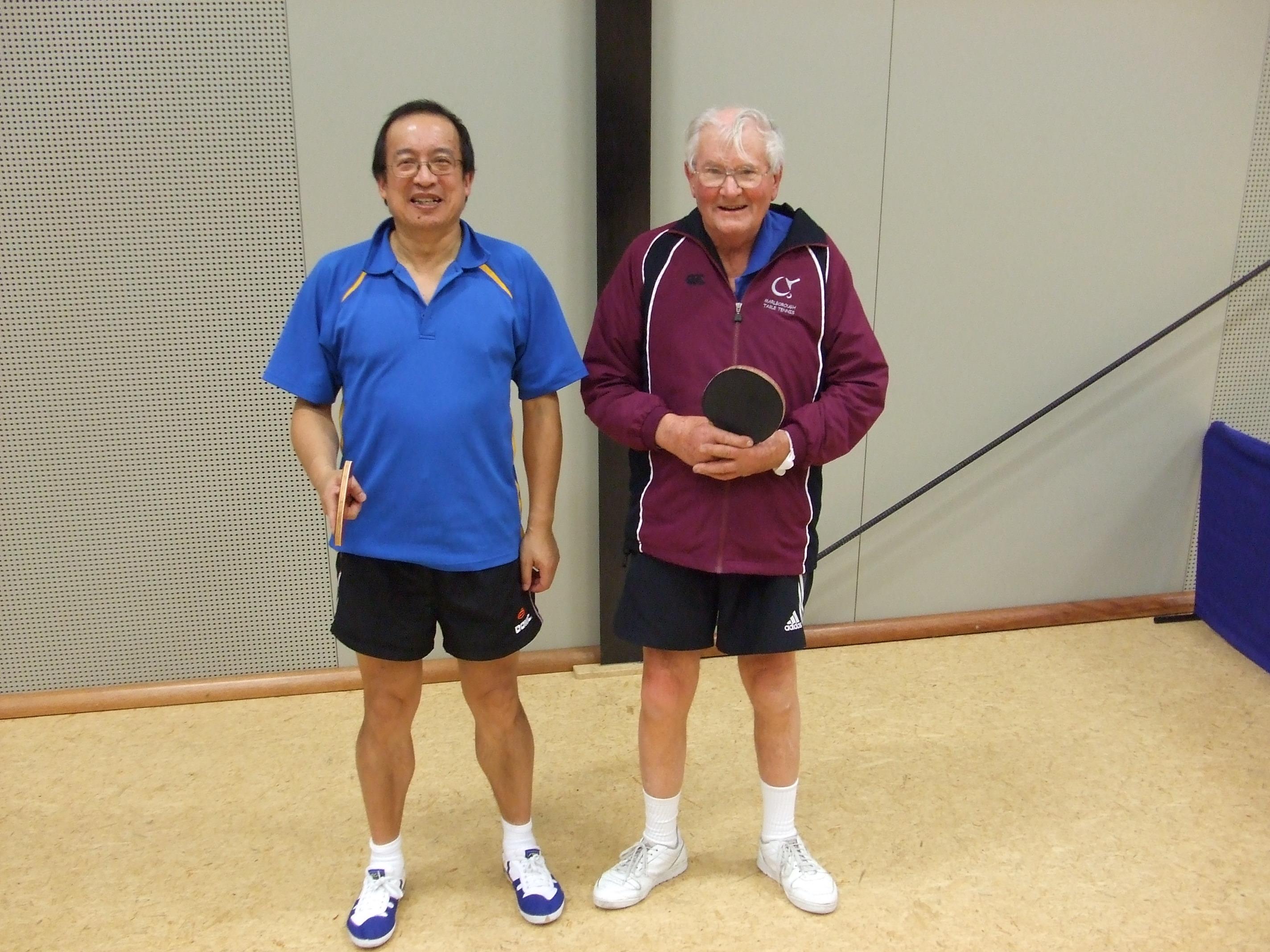 Here’s Merv on the left back in 2015 in Empire colours following silver at the NZ Vets Over 80 Men’s Doubles with Eddie Moore (on the right)Merv (also in 2015) at the Empire Table Tennis Club prize giving