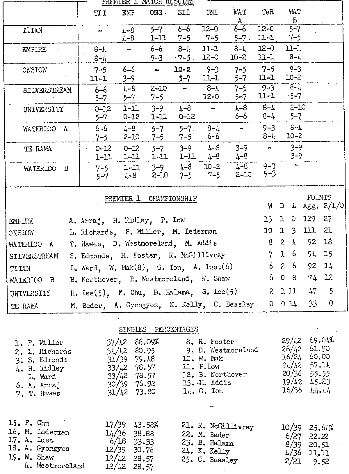 The Premier 1 Grade was won by Empire, undefeated with 13 wins and one draw, who were 6 points clear off runner up Onslow. This was despite Onslow having the top 2 players in the singles averages, Peter Miller and Lloyd Richards. Lindsay Ward is the only player from Premier 1 still playing interclub today. Current Table Tennis Wellington Life Member and committee member Bruce Northover played for Waterloo B.