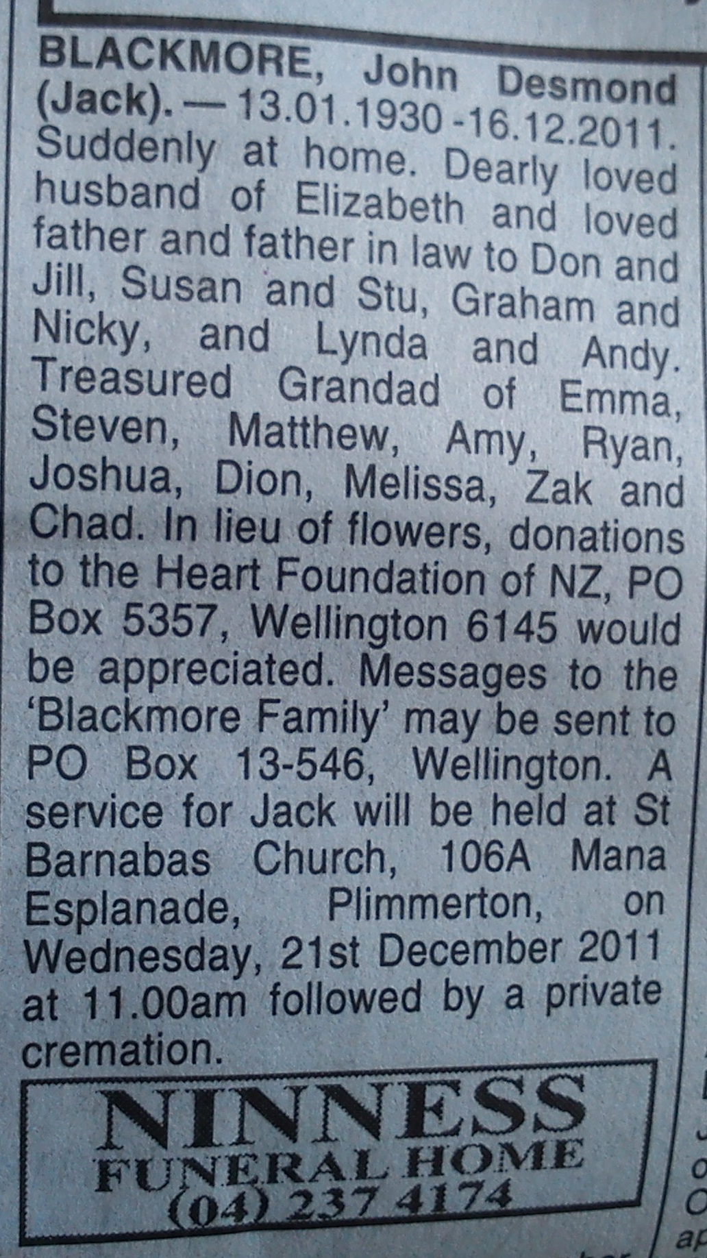 Suddenly at home. Dearly loved husband of Elizabeth and loved father and father in law to Don and Jill, Susan and Stu, Graham and Nicky, and Lynda and Andy. Treasured Grandad of Emma, Steven, Matthew, Amy, Ryan, Joshua, Dion, Melissa, Zak and Chad. In lieu of flowers, donations to the Heart Foundation of NZ, PO Box 5357, Wellington 6145 would be appreciated. Messages to the ‘Blackmore Family’ may be sent to PO Box 13-546, Wellington. A service for Jack will be held at the Barnabas Church, 106a Mana Esplanade, Plimmerton on Wednesday, 21st December 2011 at 11am followed by a private cremation.